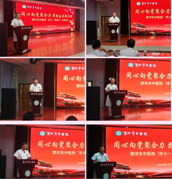 為慶祝中國共產黨成立104周年,傳承紅色基因,凝聚奮進力量,7月1日下午,漯河市中醫院在四樓大會議室開展同心向黨聚合力 團結奮進新征程“慶七一 強黨性”主題活動。醫院黨委班子、各黨支部書記、委員、入黨積極分子、發展對象、預備黨員以及優秀黨員代表等齊聚一堂,“醫”聲頌黨、以“聲”傳情,共赴一場紅色精神的傳承之約,為黨的生日送上深情祝福。