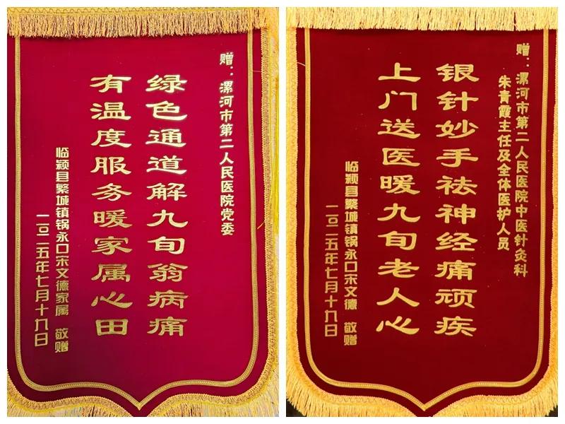 7月20日上午,市二院門診大廳暖意融融,92歲宋老先生的家屬手捧兩面錦旗,專程向醫(yī)院黨委和中醫(yī)針灸科表達最誠摯的謝意。副院長劉橋受院黨委委托與全國先進工作者、全國“五一”勞動獎?wù)芦@得者、中醫(yī)針灸科主任朱青霞及科室團隊熱情接待了家屬,并鄭重接過了這份沉甸甸的心意。