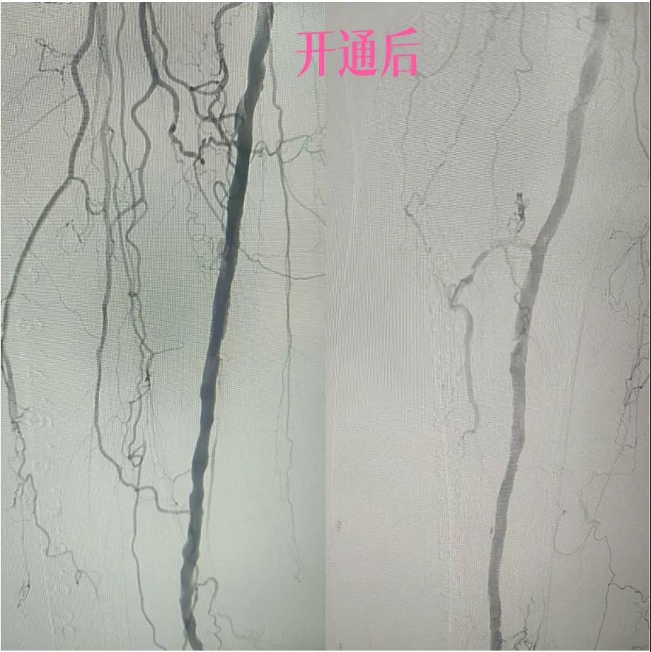 4.  即刻“見(jiàn)證”:再次造影顯示,原本狹窄閉塞的血管段血流恢復(fù)通暢!足部遠(yuǎn)端血管顯影較前明顯改善。手術(shù)過(guò)程順利,患者靜息痛較前明顯改善。