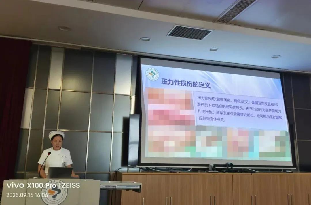 培訓伊始,壓力性損傷/傷口護理學組會診干預組長張燕燕老師帶來關于《新型敷料在壓力性損傷中的應用》的主題分享。她結合大量臨床案例,細致講解了各類新型敷料的材質特性、適用場景,以及壓力性損傷不同分期對應的敷料選擇策略、操作規(guī)范和效果評估方法。從水膠體敷料到泡沫敷料,從藻酸鹽敷料到銀離子敷料,張老師一一剖析,讓參訓人員對新型敷料的臨床應用有了更精準、全面的認識,為科學選擇和使用敷料提供了堅實理論支撐。