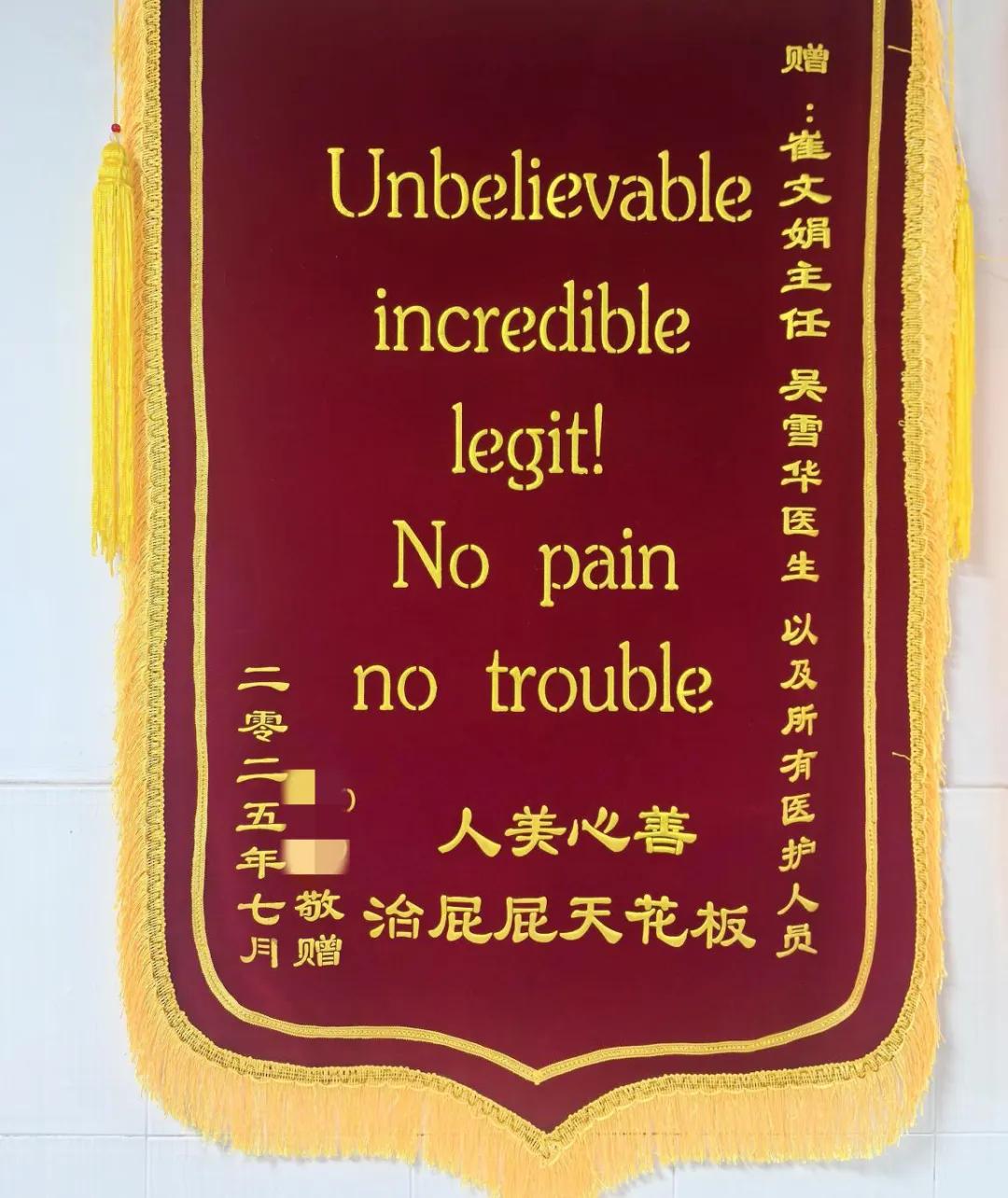 熟悉肛腸科的人都知道,這里時常因患者的 “巧思” 充滿歡樂,近期科室就接連收到了好幾面別具一格的錦旗。其中一面寫著 “Unbelievable incredible legit!No pain no trouble 人美心善 治屁屁天花板”,中西結合的表達既俏皮又真誠;還有一面則用 “手術不疼換藥不疼,肛好有你高水平!” 的諧音巧語傳遞謝意。這些充滿趣味的錦旗文字,從側面印證了肛腸科在創面疼痛管理方面取得了良好成效,也是患者對我們診療服務的肯定認可。
