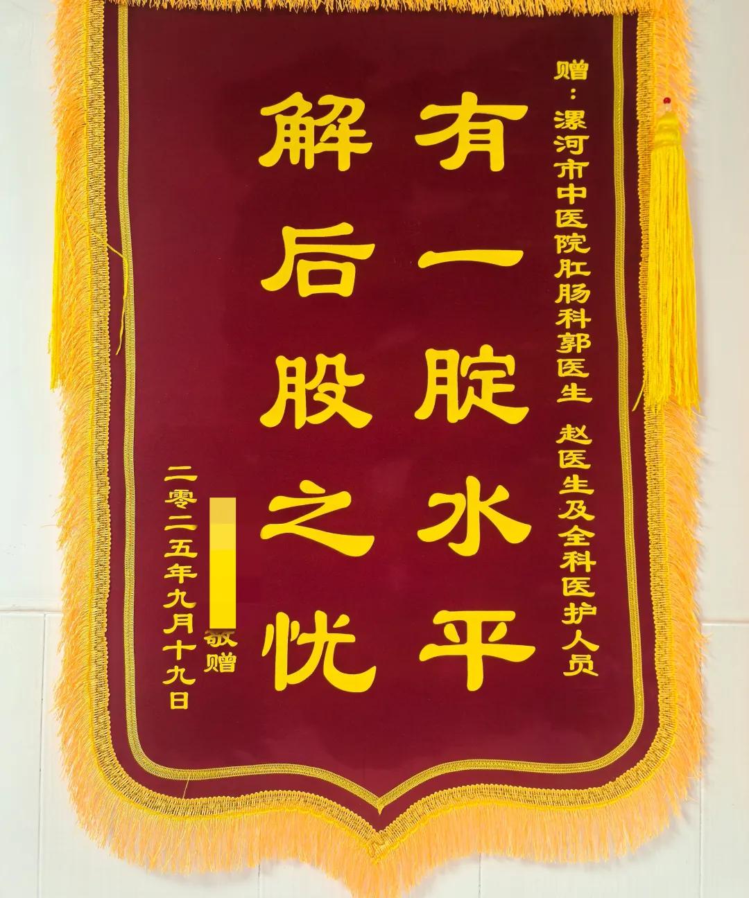近日,一位肛周膿腫術后復查的患者,特意冒雨從外地趕來,將一面寫著 “有一腚水平,解后股之憂” 的錦旗送到科室。此前,該患者因肛周膿腫飽受疼痛折磨,輾轉多家醫院仍未找到滿意的治療方案,最終選擇了漯河市中醫院肛腸科。在劉兵主任、崔文娟副主任、郭松楊主治醫師、趙蕊住院醫師及全體醫護人員的共同努力下,經精心治療與護理,患者術中術后無明顯疼痛,就醫體驗舒心,幾日前已順利痊愈出院。