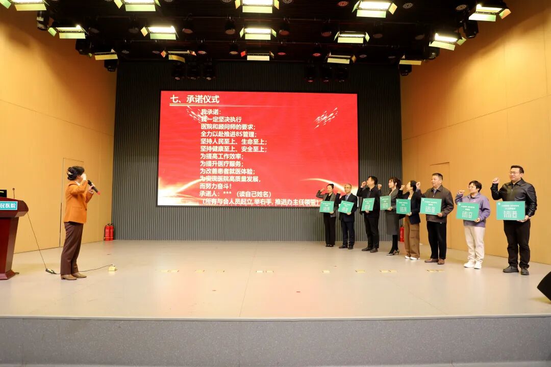 在隨后進行的承諾儀式環節,護理部主任高凱霞帶領全體與會人員莊嚴宣誓。鏗鏘有力的誓言,傳遞出全院職工全力以赴推進8S管理、提升醫療品質的堅定決心。