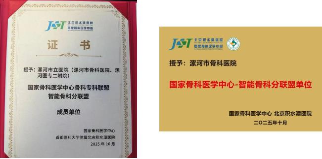 10月18日,國家骨科醫學中心骨科專科聯盟智能骨科分聯盟授牌儀式在北京積水潭醫院舉辦,漯河醫專二附院(漯河市骨科醫院、漯河市立醫院)憑借在骨科領域的卓越實力和創新探索,成為智能骨科分聯盟成員單位。