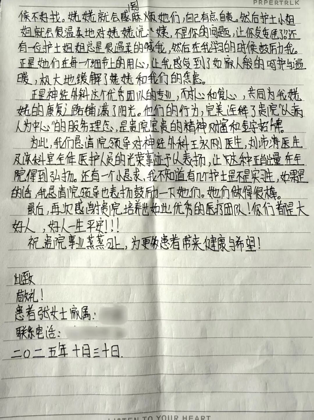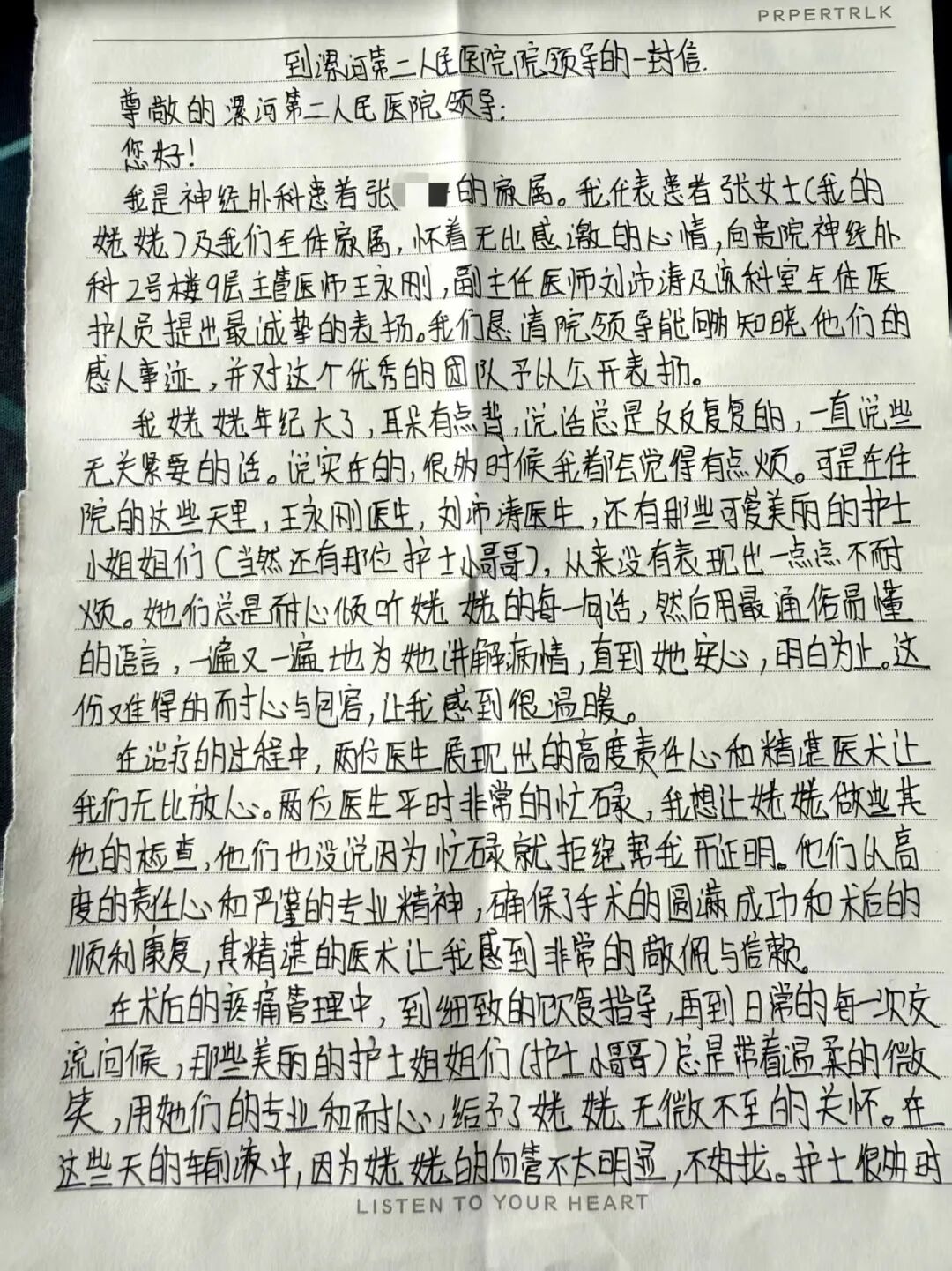 據了解,張女士的姥姥因“背部腫物”一直備受困擾,6年前在其他醫院手術治療后效果不佳,1年內復發,腫物逐漸增大,并出現肩部活動受限伴肩部疼痛。來到市二院后神經外科醫生立即進行手術,因術中腫物與周圍組織粘連嚴重,手術歷時近2個小時,術后恢復良好。“我的姥姥年紀大了,耳朵有點背,說話總是反反復復,啰啰嗦嗦的。說實在的,有時候我都會覺得有點煩??墒菑淖≡阂詠?,劉沛濤主任、王永剛醫生,還有那些美麗可愛的護士小姐姐們和帥氣的護士小哥哥,從來沒有表現出一點點不耐煩。他們總是耐心地聽姥姥講,一遍遍地解釋給她聽,直到她聽懂為止。”張女士的表揚信中字里行間包含著對神經外科整個醫護團隊暖心服務的認可與贊美。