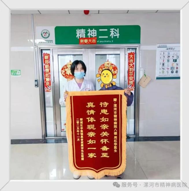 11.7日上午,患者家屬宋先生將寫著“待患如親關懷備至,真情體現親如一家”的錦旗,鄭重交到周紅華醫生手中。白大褂與便服的身影并肩而立,身后“精神二科”的門牌旁,還貼著沒摘下的新春福字,仿佛連舊歲的祝福,都在為這份醫患溫情作注。