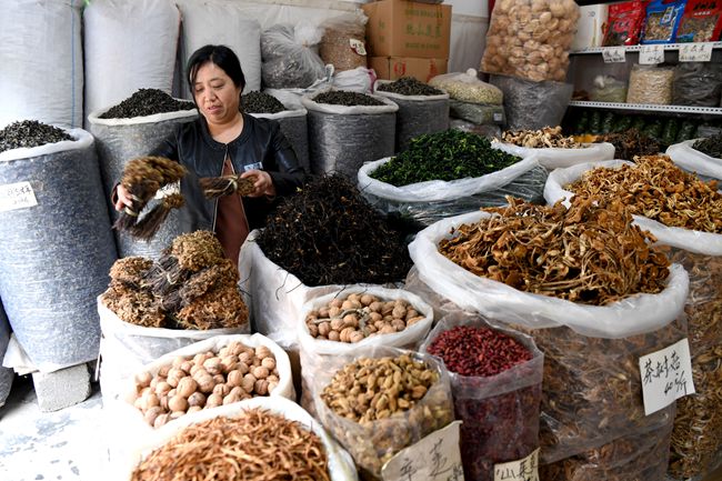 在河南省欒川縣重渡溝景區(qū),農(nóng)民李青竹在整理山貨(4月19日攝)。