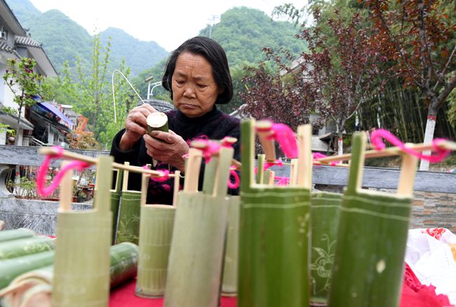 4月19日,河南省欒川縣重渡溝景區(qū)農(nóng)民劉玉蘭在制作旅游紀(jì)念品。