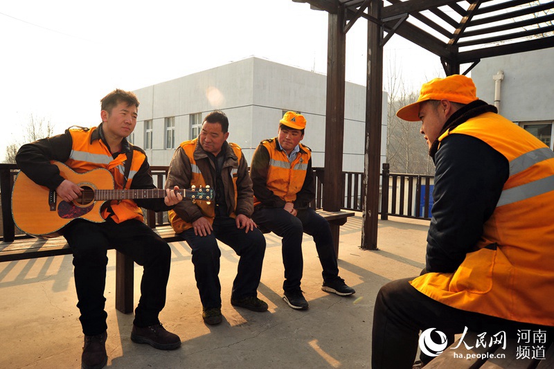 檢查完設備,回到班組已是11點。工友們圍坐在一起,喜歡唱歌的張超拿出了吉他。琴弦撥動,清脆的吉他聲在指尖流淌。