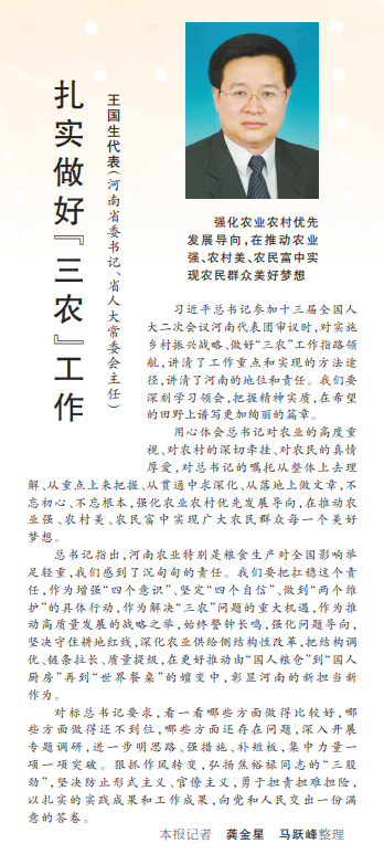 習近平總書記參加十三屆全國人大二次會議河南代表團審議時,對實施鄉村振興戰略、做好“三農”工作指路領航,講清了工作重點和實現的方法途徑,講清了河南的地位和責任。我們要深刻學習領會,把握精神實質,在希望的田野上譜寫更加絢麗的篇章。