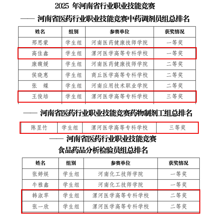 此次獲獎是學院全面貫徹學校“以學生為中心”的教育理念的結果。近幾年來,學校堅持立德樹人根本任務,全面開展“三教改革”,堅持“以賽促教、以賽促學、以賽促改”的教學理念。未來,藥學院將繼續深化“崗課賽證”融合機制,以行業需求為導向優化教學體系,為河南省醫藥行業培育更多“懂技術、精技能、能擔當”的高技能人才。(通訊員:郭昆鵬 衛永強)
