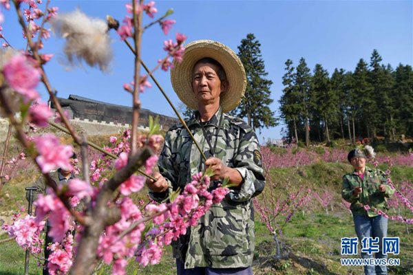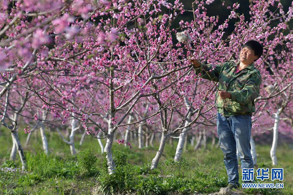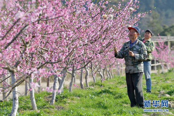 在南昌市灣里區太平鎮,農民在桃園基地內對桃樹進行人工授粉(3月19日攝)。新華社記者 彭昭之 攝