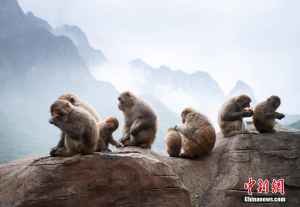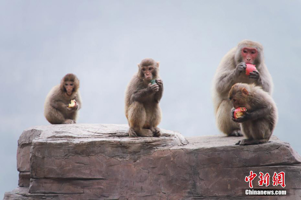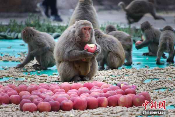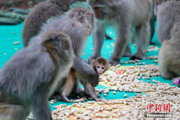 5月9日,在母親節(jié)到來之際,在位于河南濟(jì)源的太行山獼猴國家自然保護(hù)區(qū)——五龍口,工作人員為猴媽猴寶們添加營養(yǎng)餐,祝愿它們“母子平安”,現(xiàn)場用獼猴最愛吃的花生等拼成中國結(jié)圖案。圖為野生獼猴在進(jìn)食。中新社記者 王中舉 攝