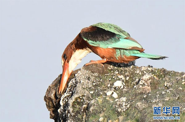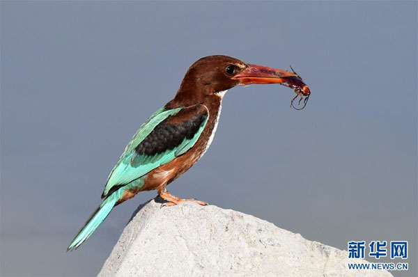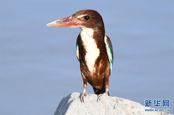7月7日,在科威特首都科威特城海濱,一只白胸翡翠站在海邊巖石上。 新華社發(哈齊 攝)