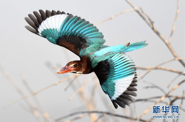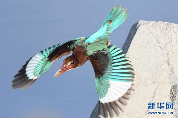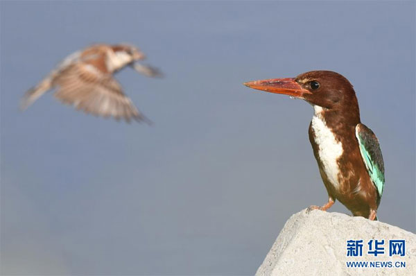 7月7日,在科威特首都科威特城海濱,一只白胸翡翠在鳴叫。 新華社發(哈齊 攝)