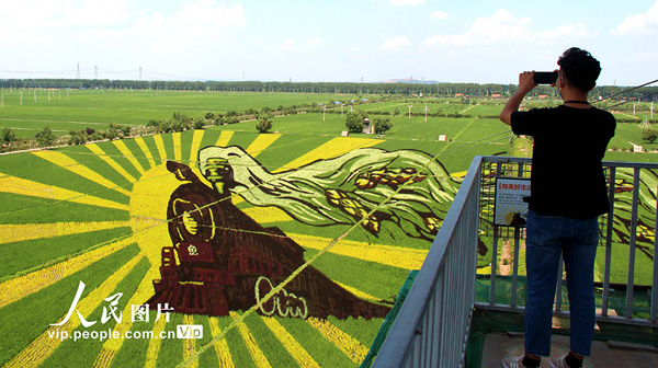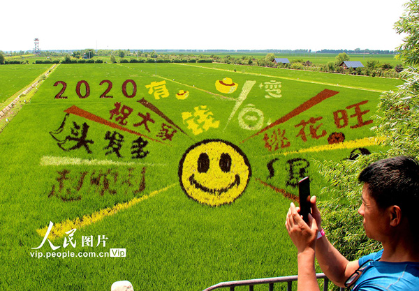2020年7月7日,位于遼寧省沈陽市興隆臺錫伯族鎮的稻夢空間園區內的3D稻田畫進入最佳觀賞期。據了解,今年園區共制作了包括《向美好生活出發》《萬眾一心》在內的十余幅稻田畫,共占地二百畝。王登虎/人民圖片
