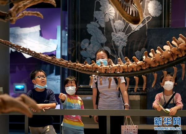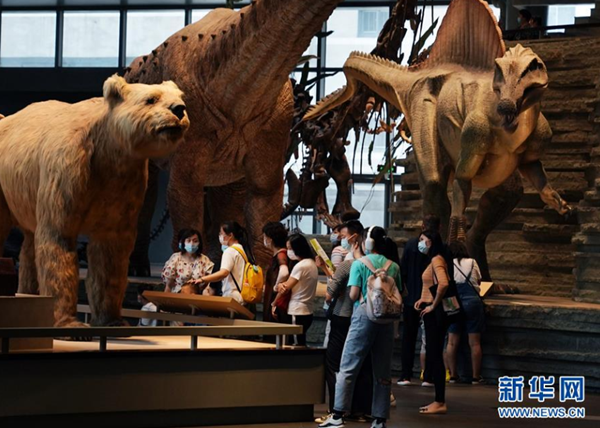 7月15日,觀眾在上海自然博物館參觀。 進入暑假,不少家長帶著孩子到上海自然博物館參觀。該展館采取實名制分時段購票參觀、參觀人數分時限流、發布次日參觀人數預測等舉措,加強防疫常態化管理。 新華社記者 劉穎 攝