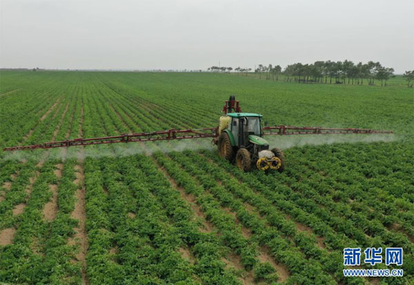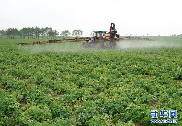 8月12日,在尚義縣三工地鎮(zhèn)有德元村,農(nóng)民使用機械設(shè)備在田間給旱作馬鈴薯噴灑農(nóng)藥。 近年來,地處壩上地區(qū)的河北省尚義縣大力實施地下水超采綜合治理,積極探索旱作雨養(yǎng)種植技術(shù),發(fā)展馬鈴薯、莜麥和油葵等旱地農(nóng)作物,促進生態(tài)環(huán)境恢復(fù)。據(jù)介紹,該縣2019年以來,先后關(guān)停灌溉用井1200余眼,旱地改草23萬畝,水澆地改旱地11萬畝。 新華社記者 楊世堯 攝
