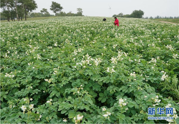 8月12日,在尚義縣七甲鄉(xiāng)媽奶溝村,農(nóng)民在田間管護旱作馬鈴薯。 近年來,地處壩上地區(qū)的河北省尚義縣大力實施地下水超采綜合治理,積極探索旱作雨養(yǎng)種植技術(shù),發(fā)展馬鈴薯、莜麥和油葵等旱地農(nóng)作物,促進生態(tài)環(huán)境恢復(fù)。據(jù)介紹,該縣2019年以來,先后關(guān)停灌溉用井1200余眼,旱地改草23萬畝,水澆地改旱地11萬畝。 新華社記者 楊世堯 攝