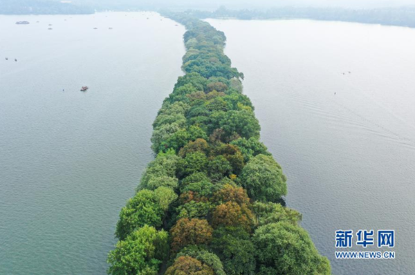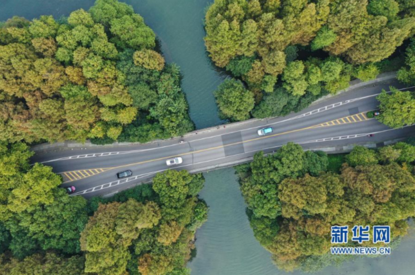 10月22日,機(jī)動車在西湖楊公堤上行駛(無人機(jī)照片)。 近日,隨著氣溫降低,杭州西湖初露秋色,顯出迷人風(fēng)韻。 新華社記者 翁忻旸 攝