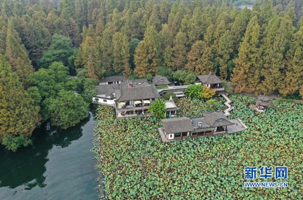 10月22日,西湖周邊的植被染上秋色(無人機(jī)照片)。 近日,隨著氣溫降低,杭州西湖初露秋色,顯出迷人風(fēng)韻。 新華社記者 翁忻旸 攝