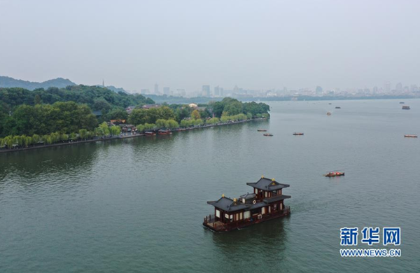 10月22日,游船在西湖上行駛(無人機(jī)照片)。 近日,隨著氣溫降低,杭州西湖初露秋色,顯出迷人風(fēng)韻。 新華社記者 翁忻旸 攝