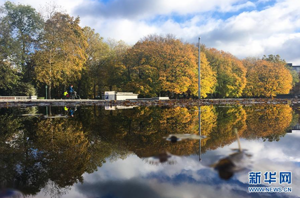 10月26日,人們?cè)诒壤麜r(shí)布魯塞爾的五十周年紀(jì)念公園騎行。 布魯塞爾秋意正濃,景色怡人。 新華社記者鄭煥松攝