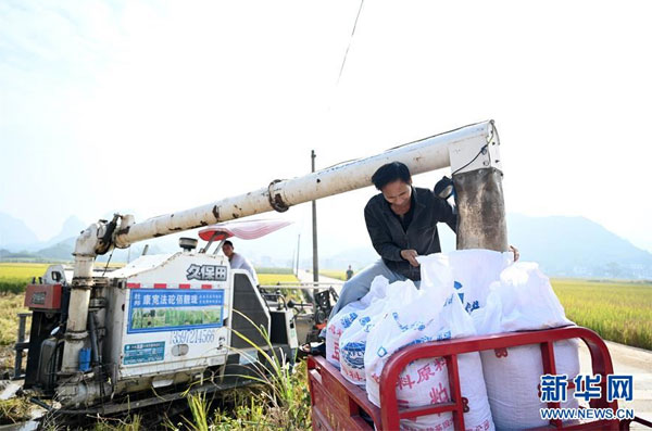 廣西柳州:深秋稻香 11月1日,在廣西柳州市柳江區進德鎮泗浪村,農民在裝運剛收割的稻谷。