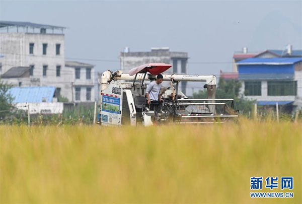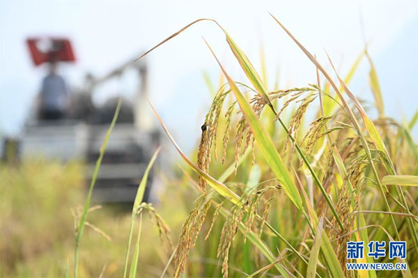 11月1日,在廣西柳州市柳江區進德鎮泗浪村,農民駕駛收割機在稻田里收割晚稻。新華社發(黎寒池 攝)