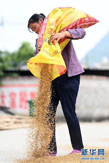11月1日,在廣西柳州市柳江區進德鎮泗浪村,農民韋鳳育晾曬剛收割的稻谷。新華社發(黎寒池 攝)