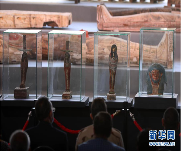 這是11月14日在埃及吉薩拍攝的彩繪木棺和其他出土文物。埃及旅游和文物部長哈立德·阿納尼14日宣布,在吉薩省塞加拉地區出土100具距今約2500年的彩繪木棺,這是埃及本年度最大的考古發現。新華社發(艾哈邁德·戈馬攝)