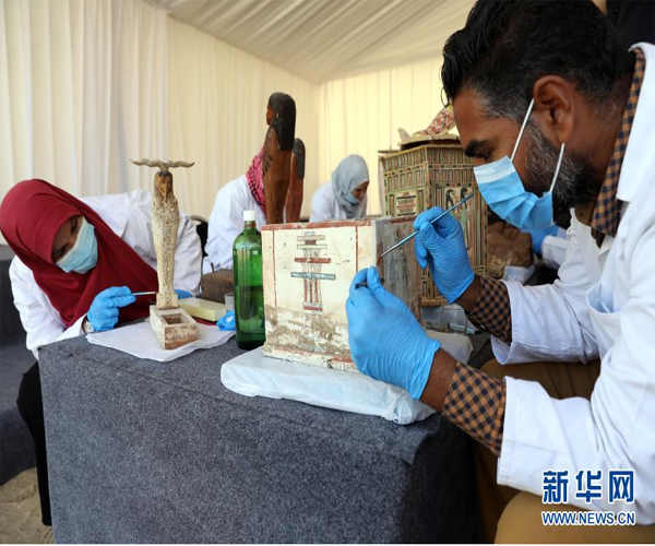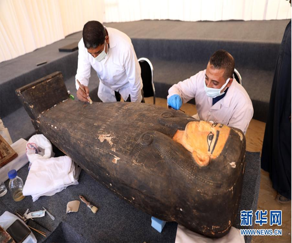 11月14日,在埃及吉薩,考古工作人員清理一具彩繪木棺。埃及旅游和文物部長哈立德·阿納尼14日宣布,在吉薩省塞加拉地區出土100具距今約2500年的彩繪木棺,這是埃及本年度最大的考古發現。新華社發(艾哈邁德·戈馬攝)