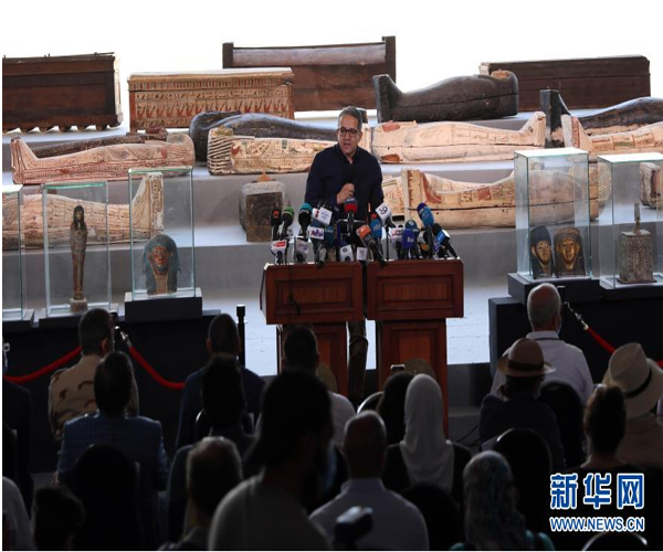 11月14日,在埃及吉薩,埃及旅游和文物部長哈立德·阿納尼在彩繪木棺發現現場講話。埃及旅游和文物部長哈立德·阿納尼14日宣布,在吉薩省塞加拉地區出土100具距今約2500年的彩繪木棺,這是埃及本年度最大的考古發現。新華社發(艾哈邁德·戈馬攝)