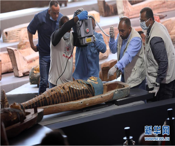 11月14日,在埃及吉薩,考古工作人員對木棺內的木乃伊進行X光檢查。埃及旅游和文物部長哈立德·阿納尼14日宣布,在吉薩省塞加拉地區出土100具距今約2500年的彩繪木棺,這是埃及本年度最大的考古發現。新華社發(艾哈邁德·戈馬攝)