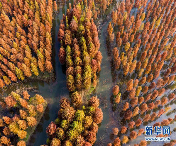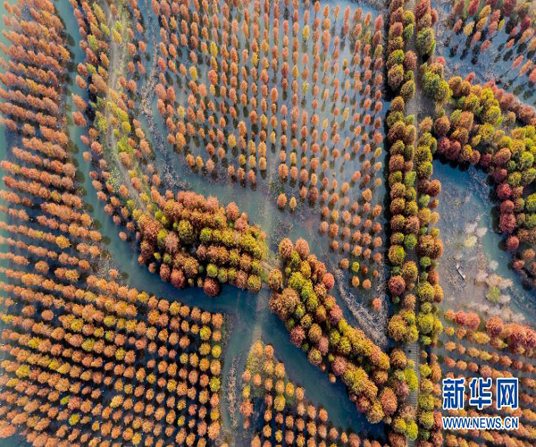 這是11月15日拍攝的江蘇省泗洪縣洪澤湖濕地杉樹林景色(無人機照片)。初冬時節,洪澤湖濕地中的杉樹林猶如披上多彩外衣,色彩斑斕,美不勝收。新華社發(許昌亮 攝)