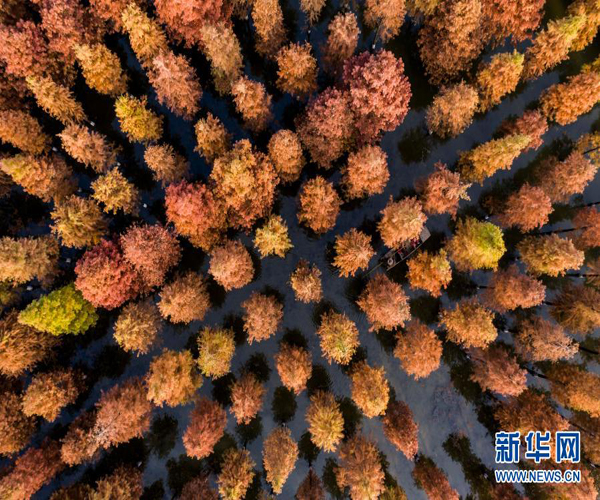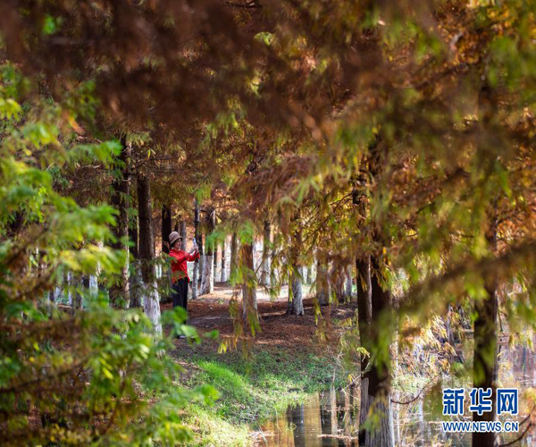 11月15日,游人在江蘇省泗洪縣洪澤湖濕地的杉樹林中游覽。初冬時節,洪澤湖濕地中的杉樹林猶如披上多彩外衣,色彩斑斕,美不勝收。新華社發(許昌亮 攝)