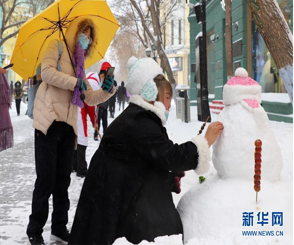 11月19日,游客在哈爾濱市中央大街堆雪人。