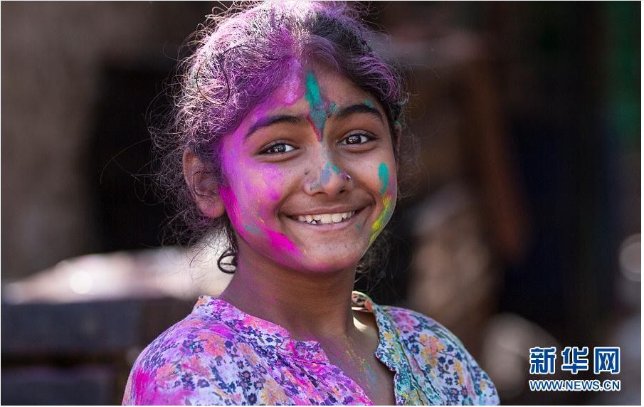 3月10日,在印度新德里,一名女孩參加灑紅節(jié)慶祝活動(dòng)。