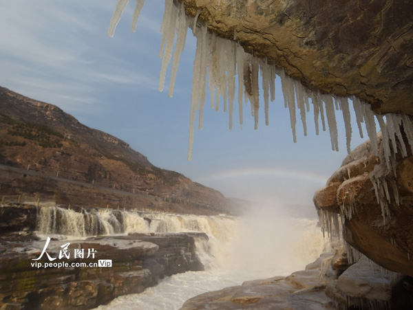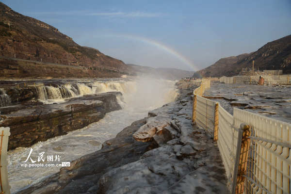 大雪時節,氣溫驟降,黃河壺口瀑布飛濺的浪花和水霧在瀑布兩岸凝結形成冰掛景觀,與瀑布上空飛架的彩虹交相輝映,美不勝收,吸引了眾多游客。呂桂明 攝(人民圖片網)