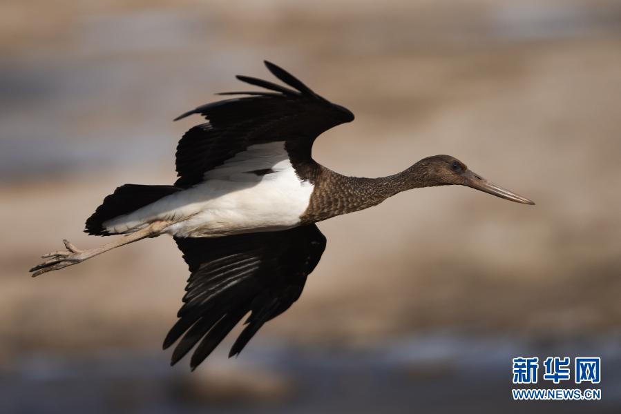 12月6日,一只黑鸛在西寧市北川河濕地公園上空飛翔。