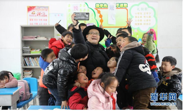 2020年12月17日,植國明在大灣小學和孩子們自拍。新華社記者 曹力攝