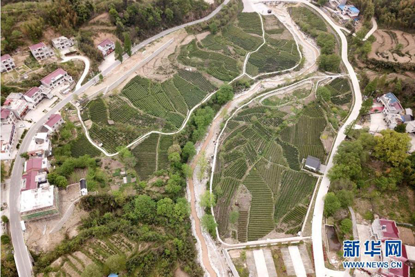 這是2020年4月17日拍攝的金寨縣花石鄉大灣村的茶產業扶貧基地(無人機照片)。新華社記者劉軍喜攝