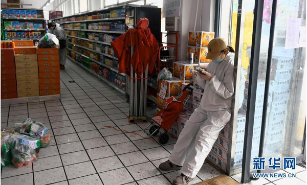 在通化市東昌區一家連鎖超市內,一名志愿者靠坐在門旁,與居民聯系確定配送地點(1月26日攝)。