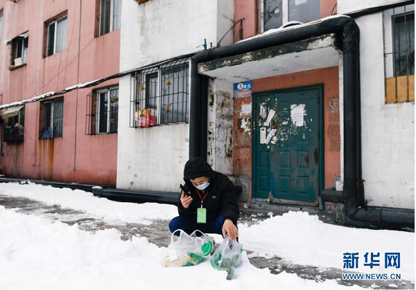 在通化市東昌區老站街道,社區工作人員為一居民小區運送生活物資時與居民聯絡(1月26日攝)。