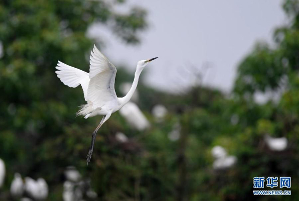 白鷺在南昌市新建區象山森林公園內飛翔(5月18日攝)。