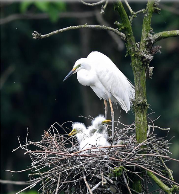 在南昌市新建區象山森林公園內,白鷺守護著雛鳥(5月18日攝)。
