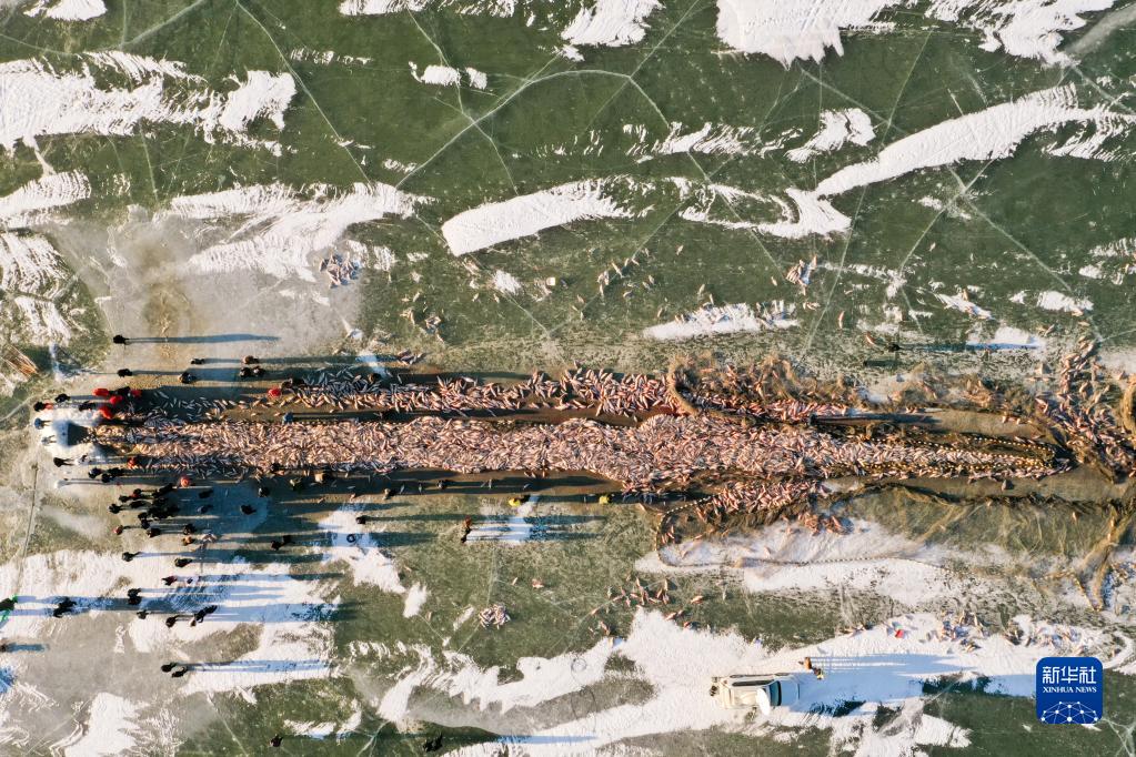 12月26日,漁民趕馬拉動絞盤,使漁網在冰面下按照既定位置放置(無人機照片)。