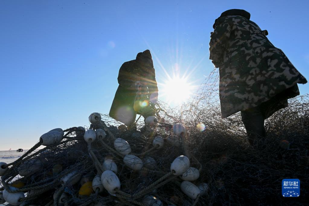 12月26日,在查干湖冰面上,漁民在做收網工作。