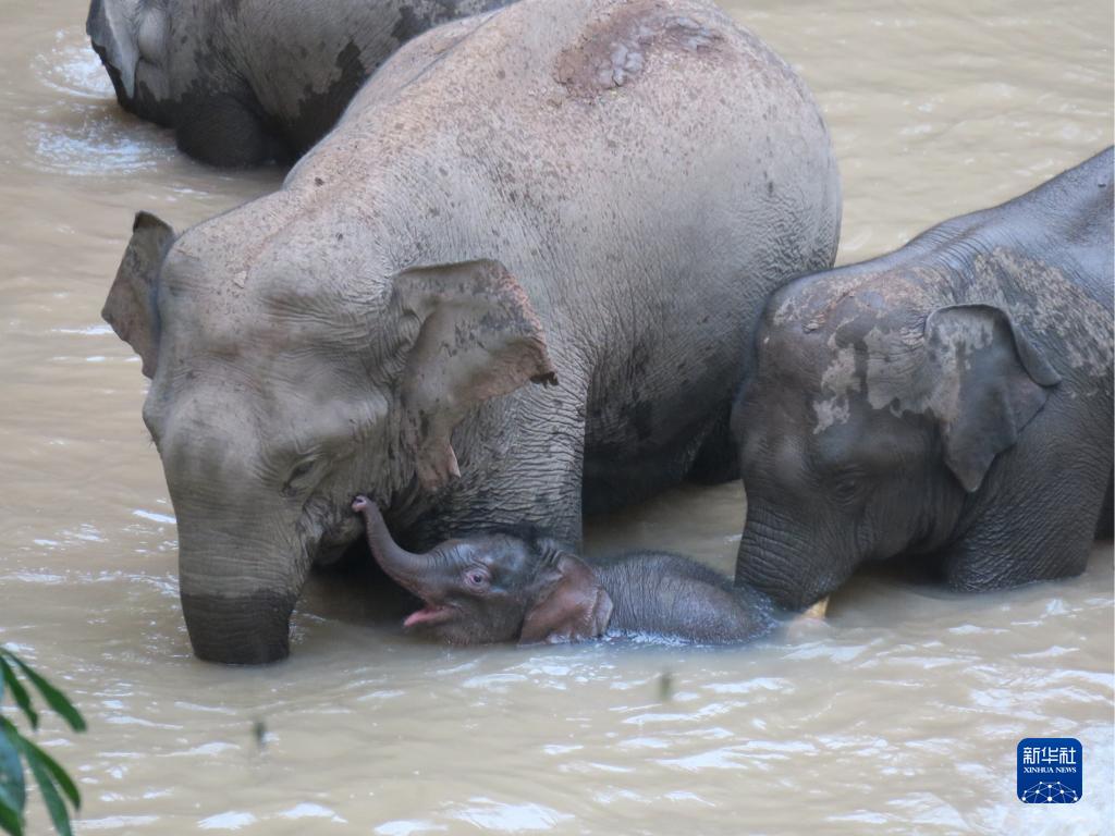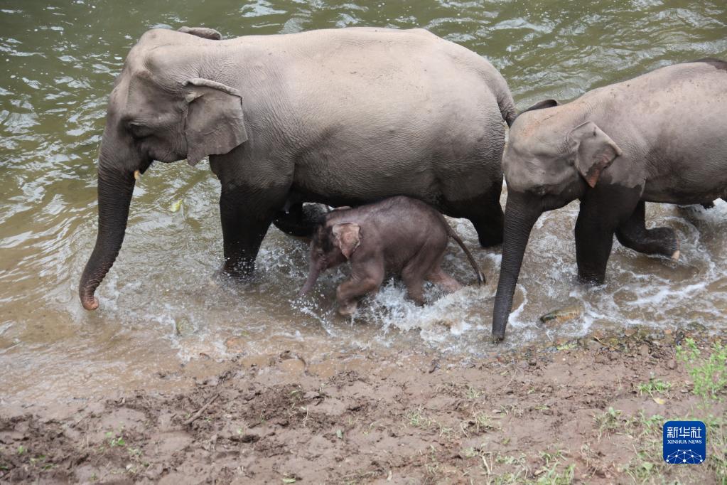 新生小象與“小缺耳家族”象群戲水(2021年11月25日攝)。