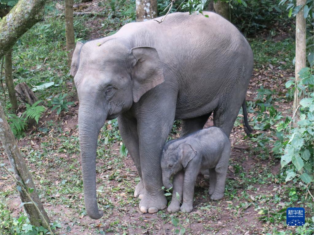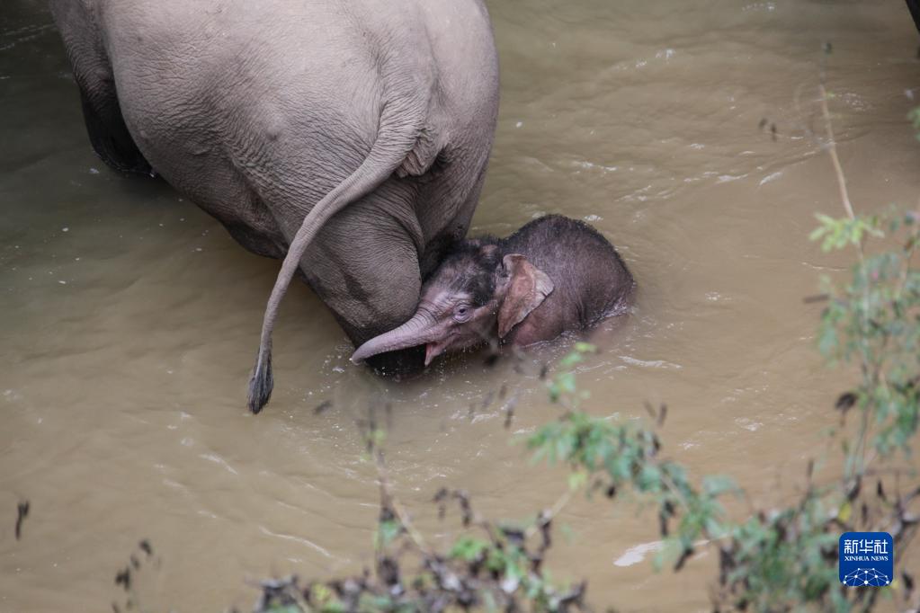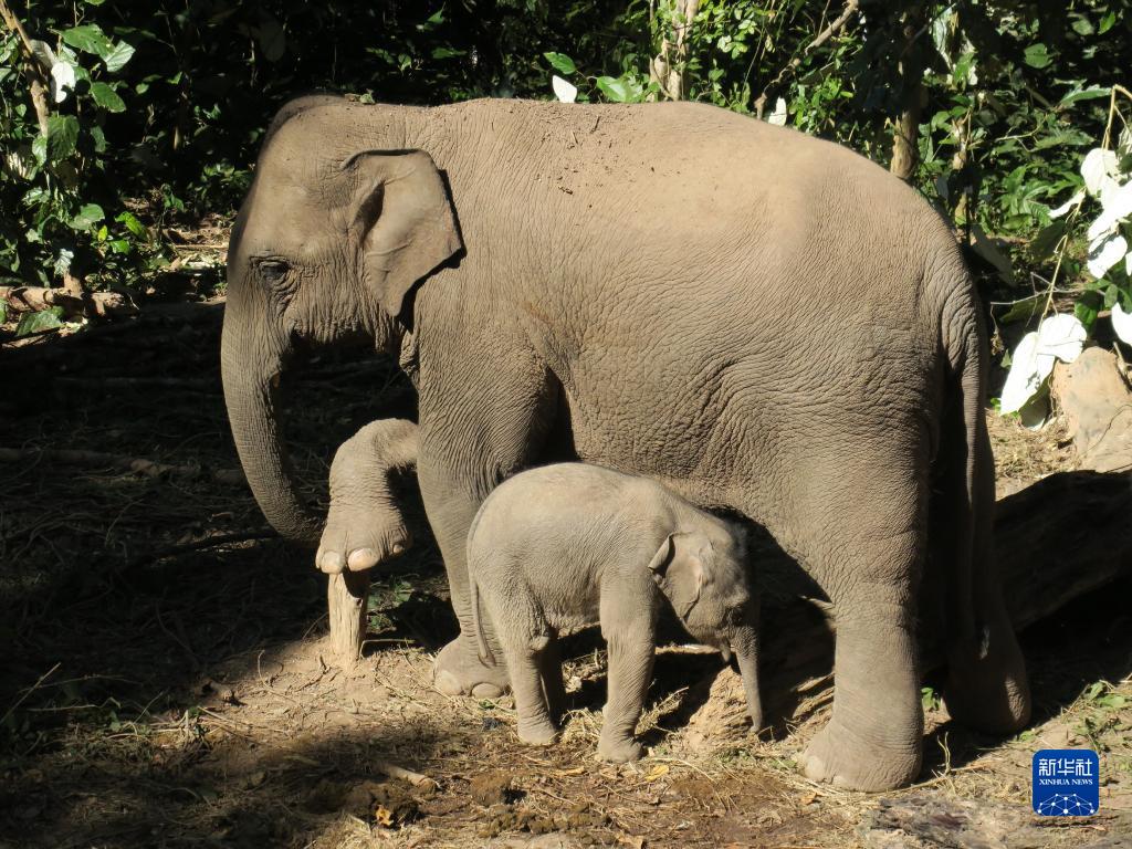 1月15日,在云南西雙版納野象谷,一頭新生小象緊跟在象媽媽身后。